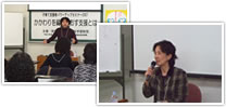 - 冊子『むすんでひらいて 編みなおして』を活用した本セミナーは、絵本の読みあいなどユニークなワークを組み入れたプログラム構成で、「関係づくりの視点」を体験的に学び、子育て支援の資質向上をめざしました。冊子作成にかかわった田代和美さん・岩川直樹さん・村中李衣さん・渡辺美恵子さんの4人の方々に、講義やワークを担当していただき、2日間のセミナーは密度の濃い内容・展開となりました。