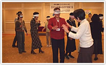 目隠しして、互いの声だけを頼りに相手を探すワーク。相手に出会うまでの不安と出会った喜びを体験し、参加者全員の距離が一挙に縮まりました。